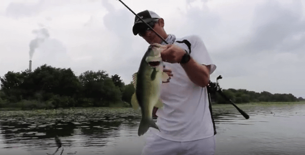 I liked how he trimmed to frog to make the weedless frog lure work through the lily pads better. He rigs the topwater frog on his wife’s line and explains how to present it to the bass.