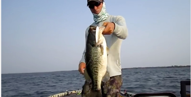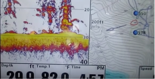 Justin establishes his location on submerged point with his electronics before he starts fishing. He explains the use of his equipment and how to pinpoint an area on the ledge where the bass have grouped. This part is very instructional as how to and why lesson. His key advice to learn what the fish look like on your personal viewer since each type has its own presentation of fish. If your have new equipment you need to test on an area where you know the bass are or check the area by catching a bass. Bring one or two marker buoys to mark the spot where the group is located. Justin shows you how he found a large group of bass huddling together on a section of the point in about 25 feet of water.